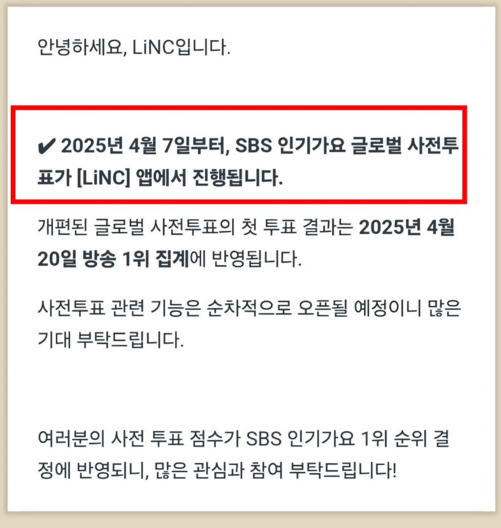 13일(일) SBS 인기가요 방송일정이 취소됨에 따라 글로벌 사전투표 일정도 변경되어 4월 7일부터 LiNC(링크)앱에서 진행됩니다