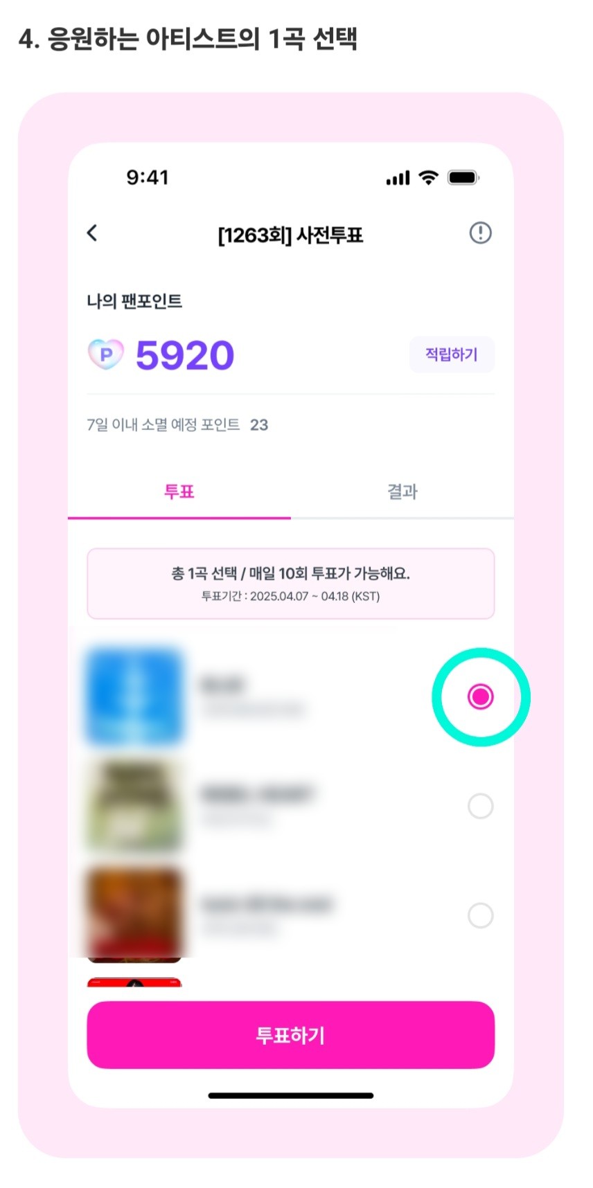 4월 7일부터 링크(LiNC)앱에서 진행될 인기가요 투표는 응원하는 아티스트의 곡을 1곡 선택해 투표할 수 있으며, 1회 투표시 팬포인트 10P가 필요(4월 프로모션), 1일 총 10회까지 투표가 가능합니다