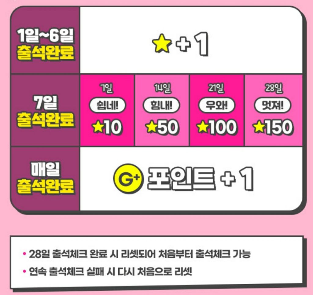 매일매일 출석을 하게되면 출석일수에 따라 일반별이 추가 지급되며 연속 출석에 실패시 1일부터 다시 돌아가게 되니 연속 출석 실패하지 않도록 주의해주세요