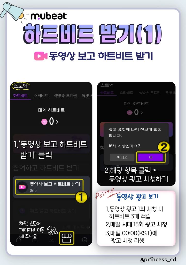 하트비트는 동영상 광고 시청 및 비트박스, 퀴즈등을 통해 모을 수 있으며 동영상 광고의 경우 1회 시청에 3개의 하트비트를 얻을 수 있으며 계정당 1일 15회 보기가 가능하고 매일 자정 리셋됩니다