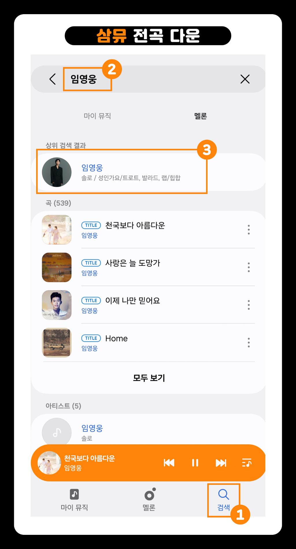삼성뮤직 앱에서 하단의 검색 클릭한 후