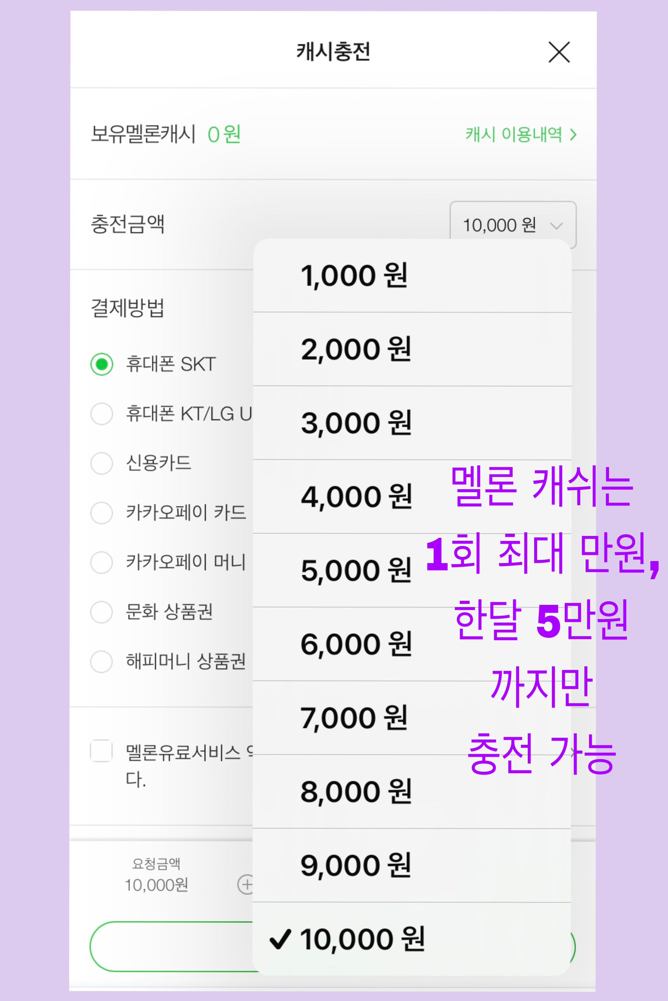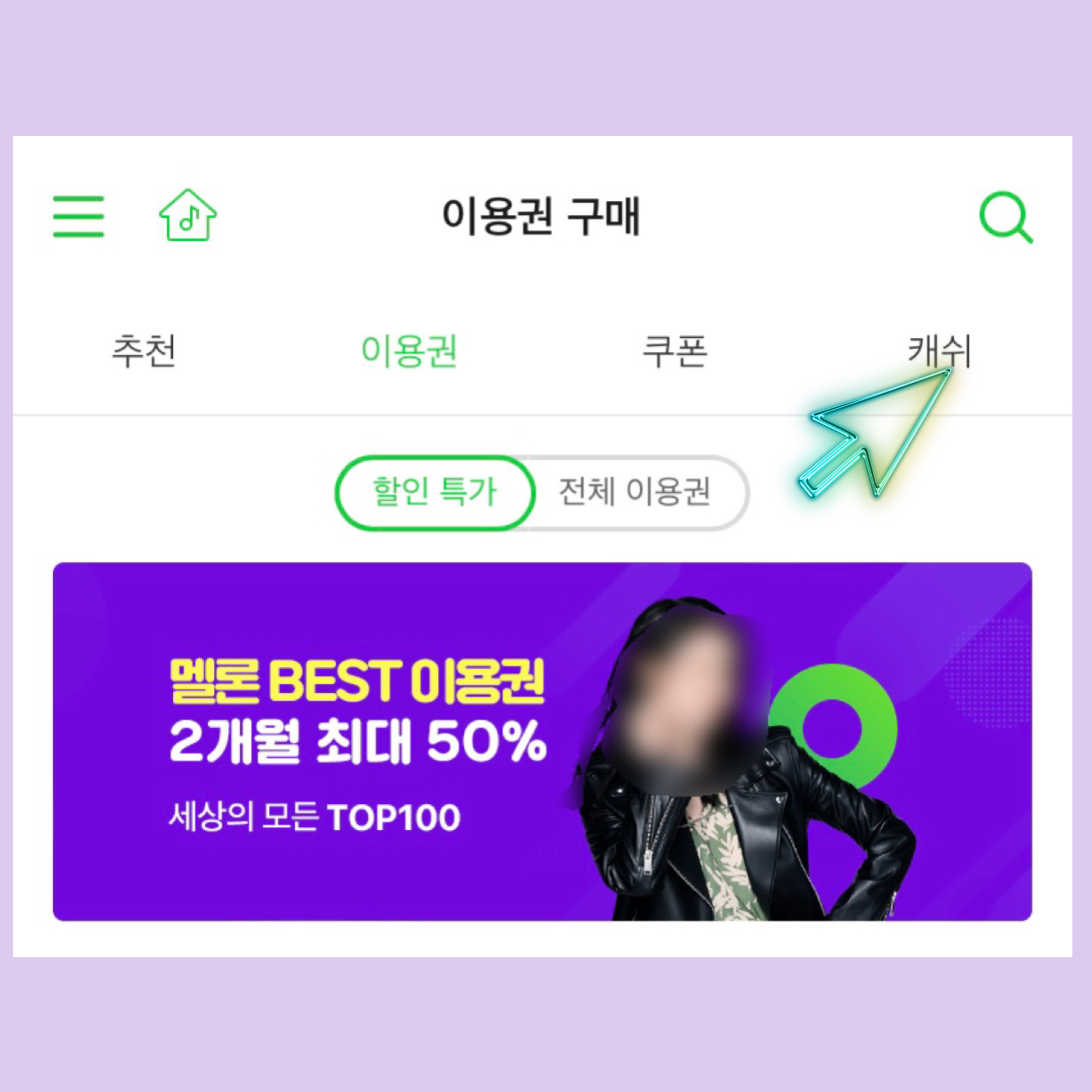 λͺ¨λ°μΌ μΉ(https://m2.melon.com) > λ©λ΄ > μ΄μ©κΆ ꡬ맀 > λ©λ‘ μΊμ¬ μΆ©μ