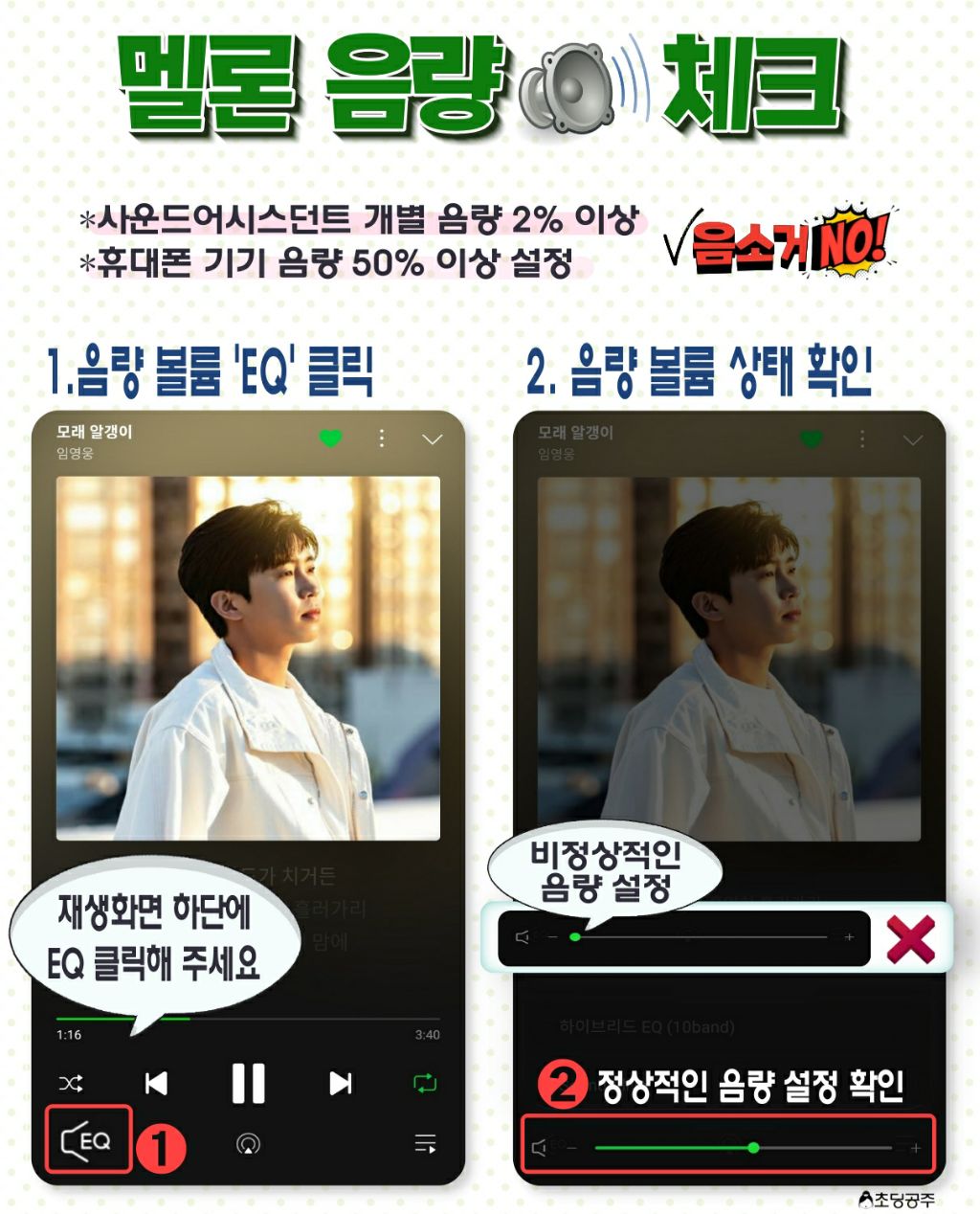 멜론 내 볼륨바가 0이면 기기볼륨 (미디어볼륨)이 0 이니 무음스밍이 안되게 한번씩 체크해주세요