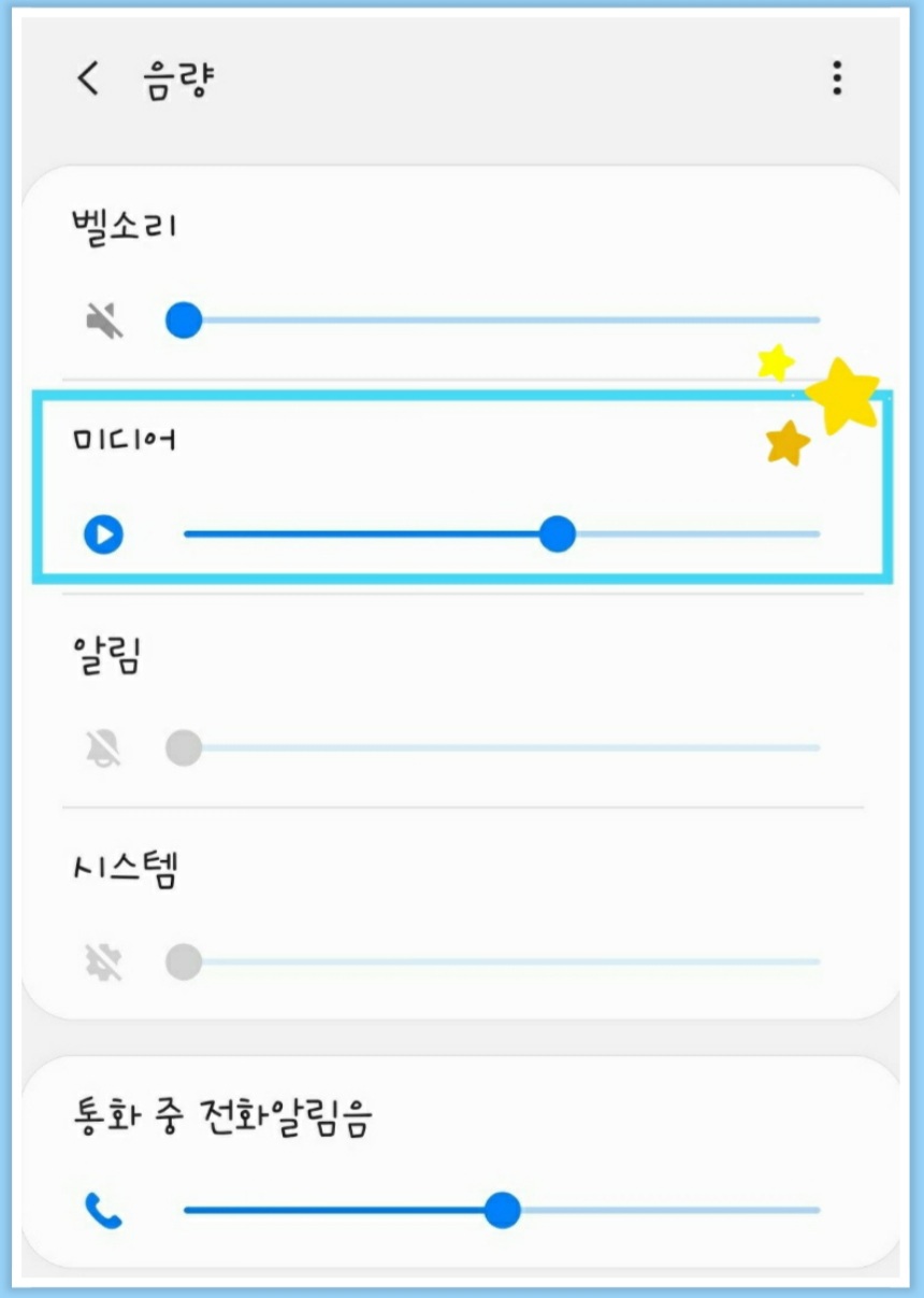 2️⃣ 핸드폰 설정 ▶️ 소리 및 진동 ▶️ 음량클릭 ▶️ 미디어 옆 파란색바를 옆으로 밀어 전체의 반이상 올리기