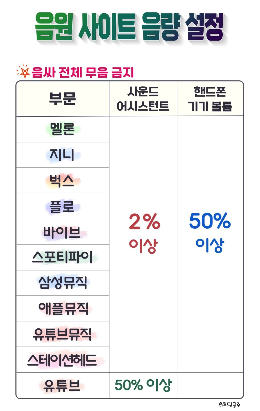 아이폰으로 글로벌 음싸를 제외한 멜론, 지니, 벅스, 플로, 바이브 중 하나의 음싸를 스밍하시거나 폰에서 글로벌 음싸와 같이 동시스밍을 하지 않으시는 경우에는 무음스밍이 아님 되기에 "기기음량을 2% 이상 사운드어시스턴트 2% 이상"으로 놓고 스밍하심 됩니다💥💥💥
