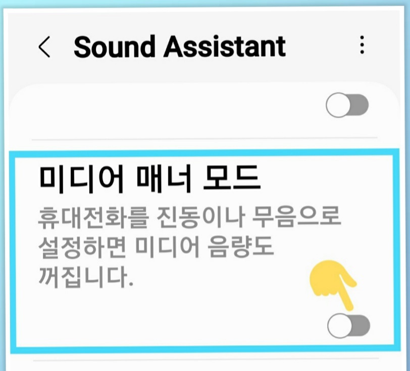 사운드어시스턴트에서 미디어 매너모드가 있는 폰들은 사진과 같이 OFF 상태(회색)인지 꼭 확인해주세요