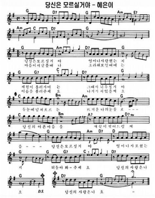 당신은 모르실거야 혜은이 당신은 모르실꺼야 얼마나 사랑했는지 세월이 흘러가면은 그때서 뉘우칠거야 마음이 서글플때나 초라해 보일때에는 이름을 불러주세요 나 저기 서 있을게요 두 눈에 넘쳐흐르는 뜨거운 나의 눈물로 당신의 아픈 마음을 깨끗이 씻어드릴게 당신은 모르실꺼야 얼마나 사랑했는지 뒤돌아 봐 주세요 당신의 사랑은 나요 두 눈에 넘쳐흐르는 뜨거운 나의 눈물로 당신의 아픈 마음을 깨끗이 씻어드릴게 당신은 모르실꺼야 얼마나 사모했는지 뒤돌아 봐 주세요 당신의 사랑은 나요 당신의 사랑은 나요 |
