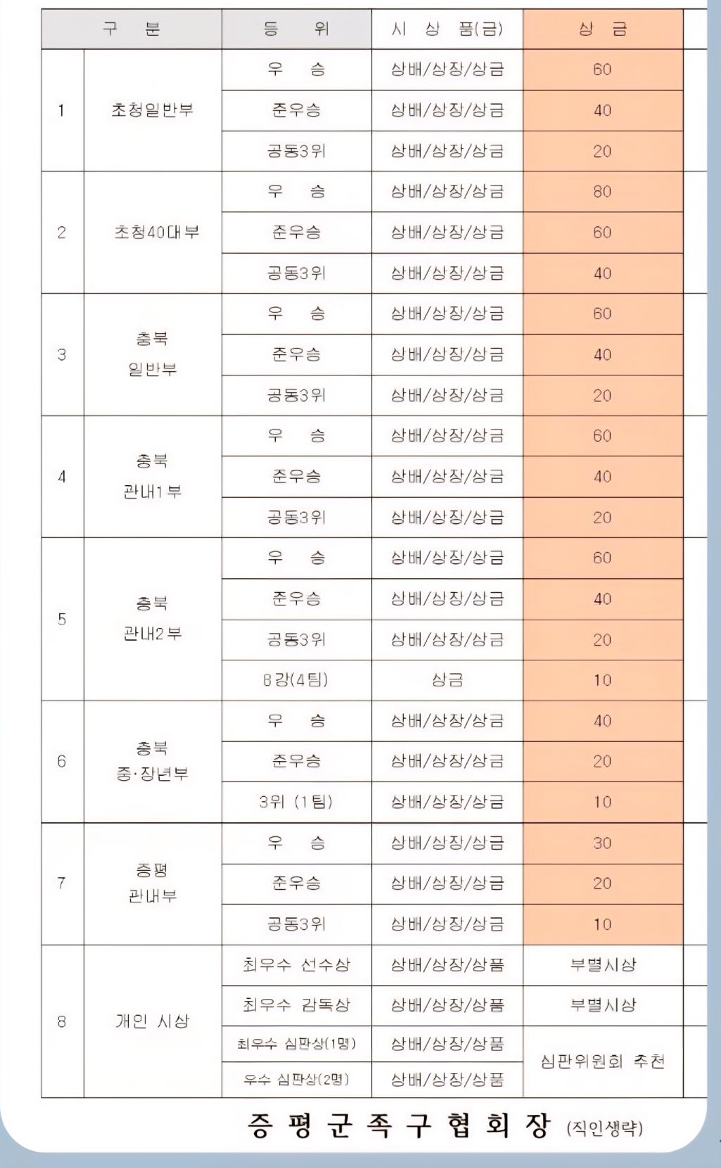 높은 상금으로 선수들 격려해주신 증평군 족구협회에도 진심으로 감사드립니다.이번 참가팀별 최종 상금공지 입니다.먼길 오시는 선수분들 안전하게 조심히오시고 경기 운영에 불편함이 없으시도록 열심히 준비해놓겠습니다.내일 뵙겠습니다.감사합니다