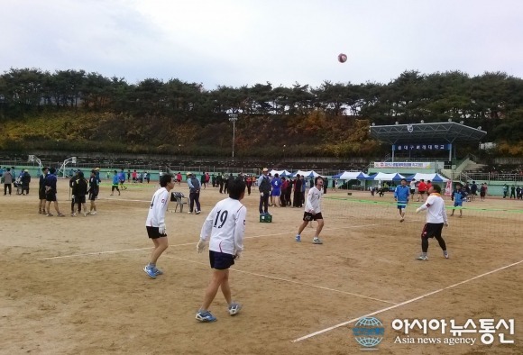 | 10일 대구미래대학교 대운동장에서 경산시 족구 동호인들의 축제인 '제1회 경산시생활체육회장배 족구대회'가 열리고 있다.(사진제공=경산시청) |