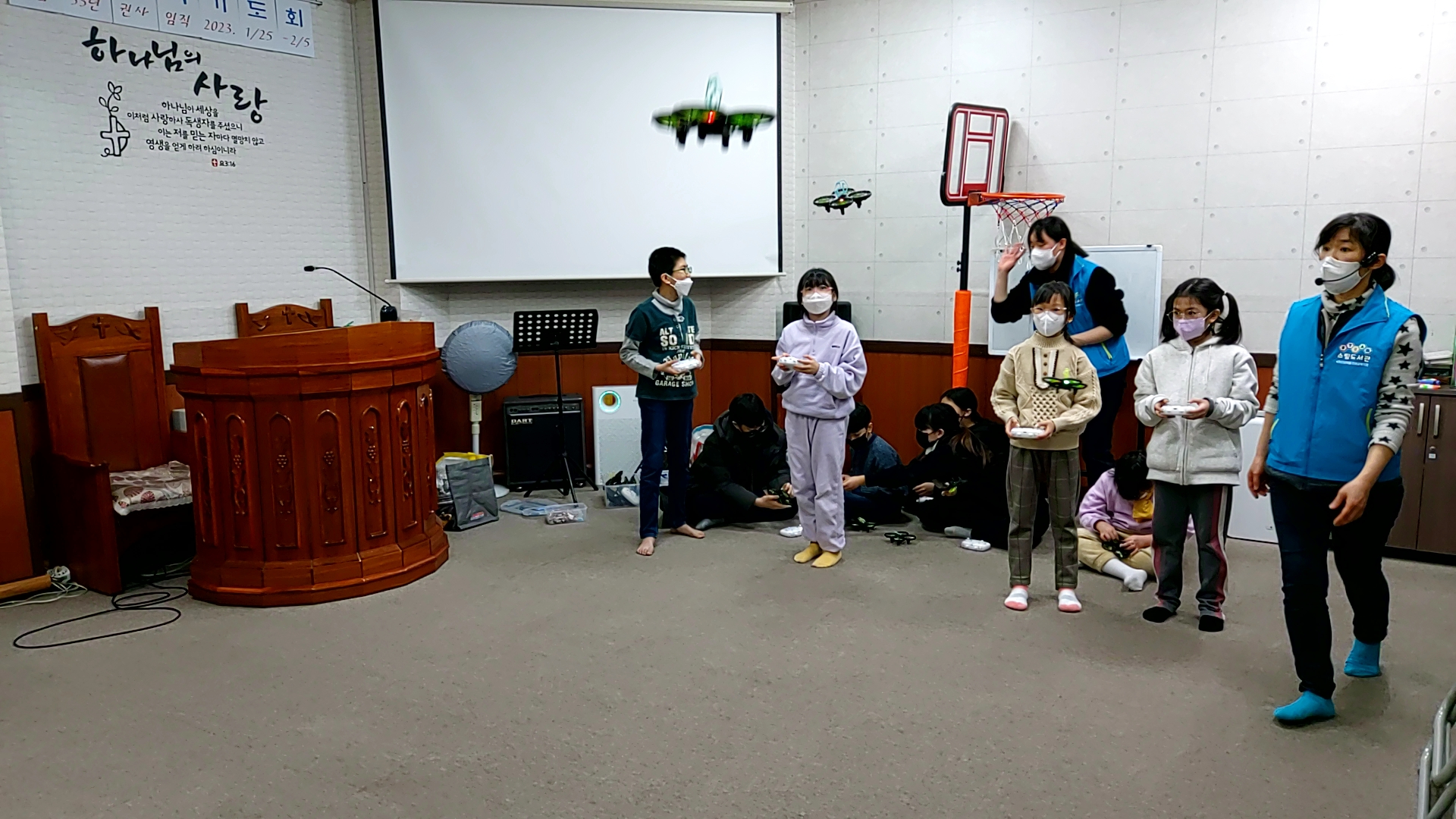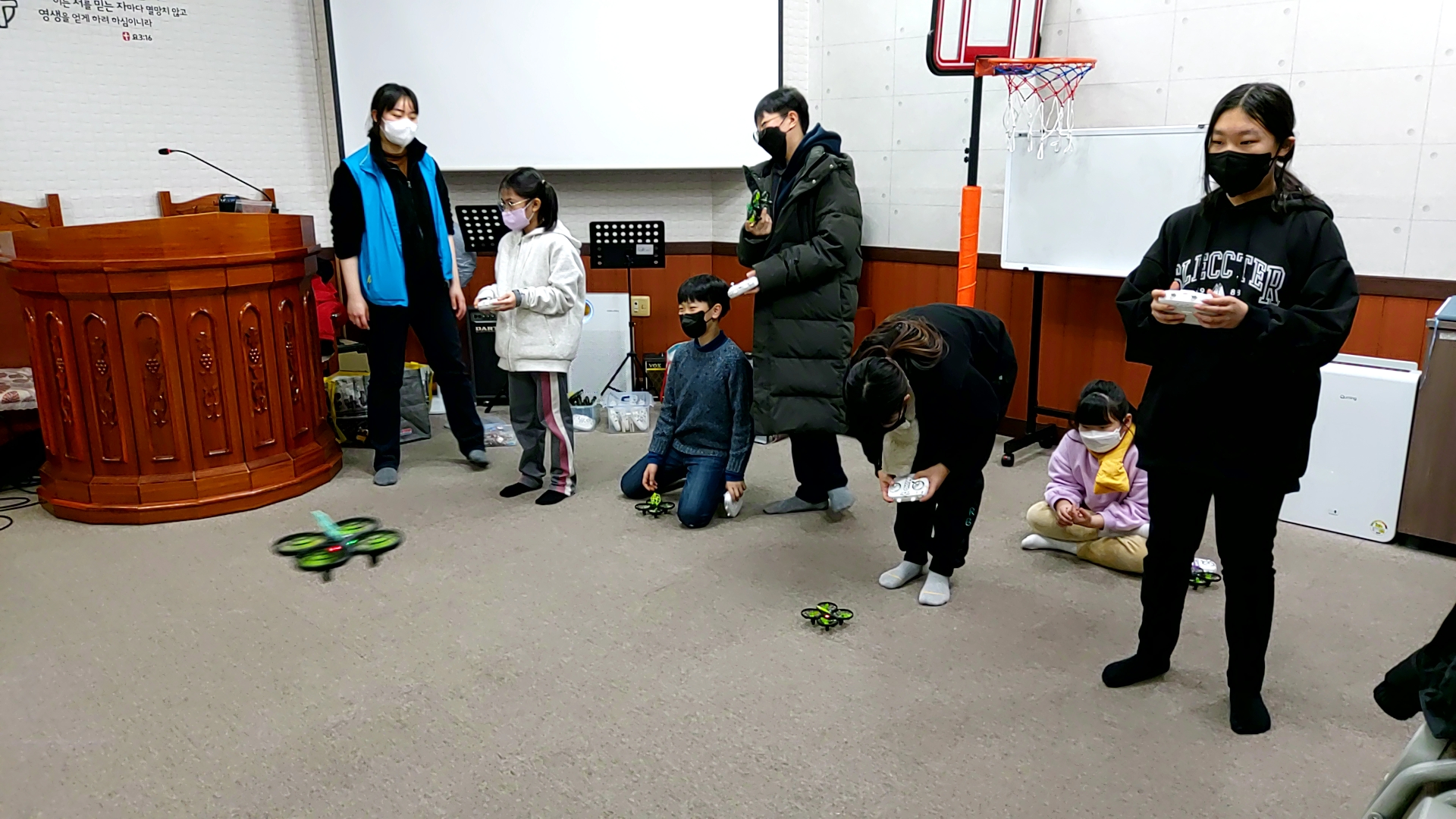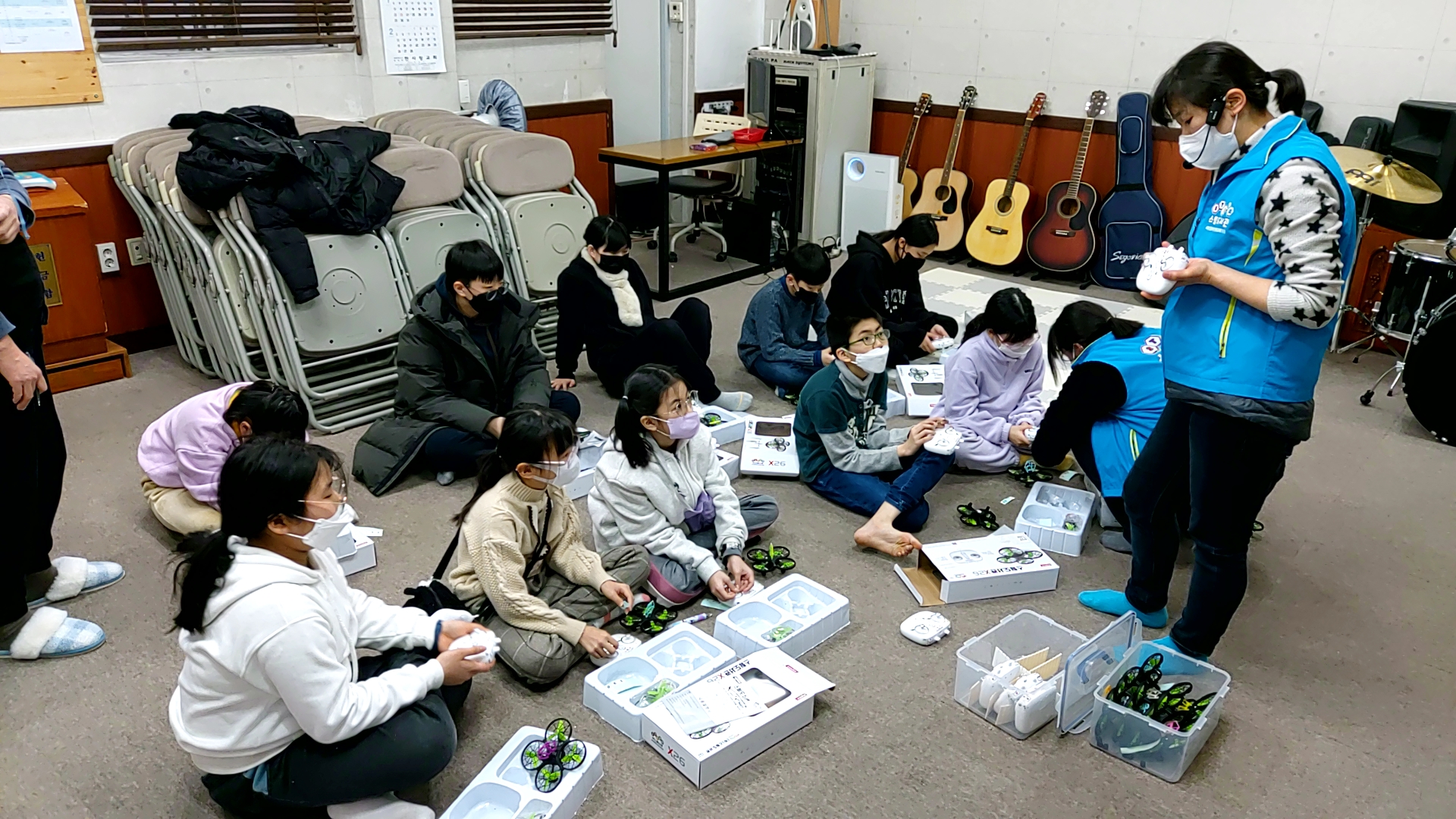 2022겨울방학 신기술 진로체험 특강으로 드론 수업을 받았어요. 스팀도서관과 구로구 직업체험센터에서 주관하여 센터 친구들에게 드론 작동법을 알려주시고, 선물로 10세트도 주고 가셨어요. 드론을 이렇게 쉽게 배워서 날릴 수 있다니 신기하고 모두 즐거워 보이네요~
