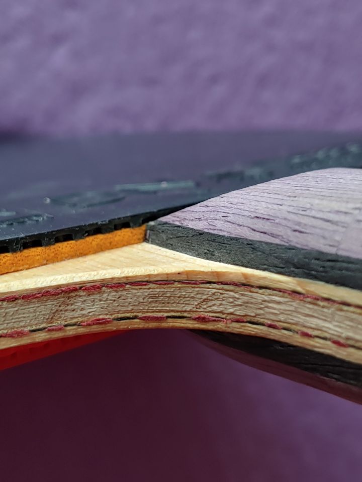 사담이 길었네요. 바토스 클래식이 아직 주력이다보니 오스카 클래식은 여러가지로 성격이 다르게 느껴졌습니다. 우선은 전체 무게가 증가하였구요, 스피드도 조금 증가하였고, 감각도 상대적으로 단단해지고(예전에 에이스 블레이드를 사용하던 느낌이 났지만 에이스 블레이드처럼 각목을 치는 느낌은 아닙니다), 볼의 궤적도 상당히 직선적으로 변합니다. 또한, 아래의 사진에서 보시듯, 히노끼표층의 두께가 매우 두껍습니다.