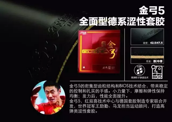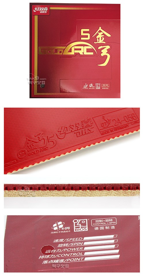 In the official introduction, Gold-arc 5 rubber adopts the BIOS technology to provide with stable control and excellent hand-feeling. By hitting the ball in small strength, the friction and bounce are balanced without feeling decreased elasticity and friction. When the player hits the ball in great strength, the rubber requires higher power to reach its full performance. So the more powerful strength you play with, the better catapult effect there will be. I think Gold-arc 5 deserves its reputation for its all-round performance.