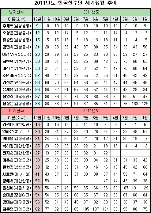 2011년 한국선수 세계랭킹 추이(100위 이내) 작성자짱가(수원)|작성시간12.01.04|조회수395 목록 댓글 2 글자크기 작게가 글자크기 크게가 다음검색 현재 게시글 추가 기능 열기 북마크 공유하기 신고 센터로 신고 댓글 댓글 2 댓글쓰기 답글쓰기 댓글 리스트 작성자존심 | 작성시간 12.01.04 랭킹으로만 보면 김민석선수가 가장 고무적이네요...마지막 랭킹이 제일 높은 랭킹이군요...앞으로도 발전 가능성이 높군요 작성자royalhunt | 작성시간 12.01.06 참 보기쉽군요! 김민석 양하은선수 기대됩니다! 댓글 전체보기