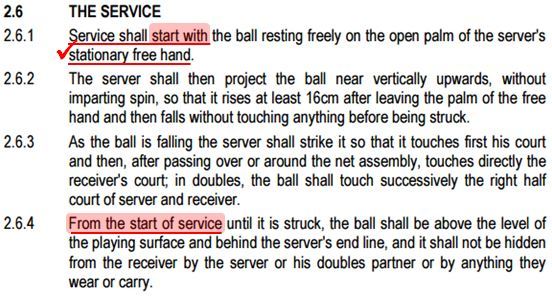 즉, 서비스는 서버의 몸이 움직이는 상태에서는 시작될 수 없는 것이며, (만일 그랬다면 랠리의 시작이 판별된 이후 서비스 폴트로 간주되어 포인트가 결정됩니다.) 이 얘기는 공이 손을 떠나기 전에 행해질 수 밖에 없는 정상적인 토스 동작(팔의 움직임) 구간이 서비스 개시 이전이라고 할 수 없는 것이지요.