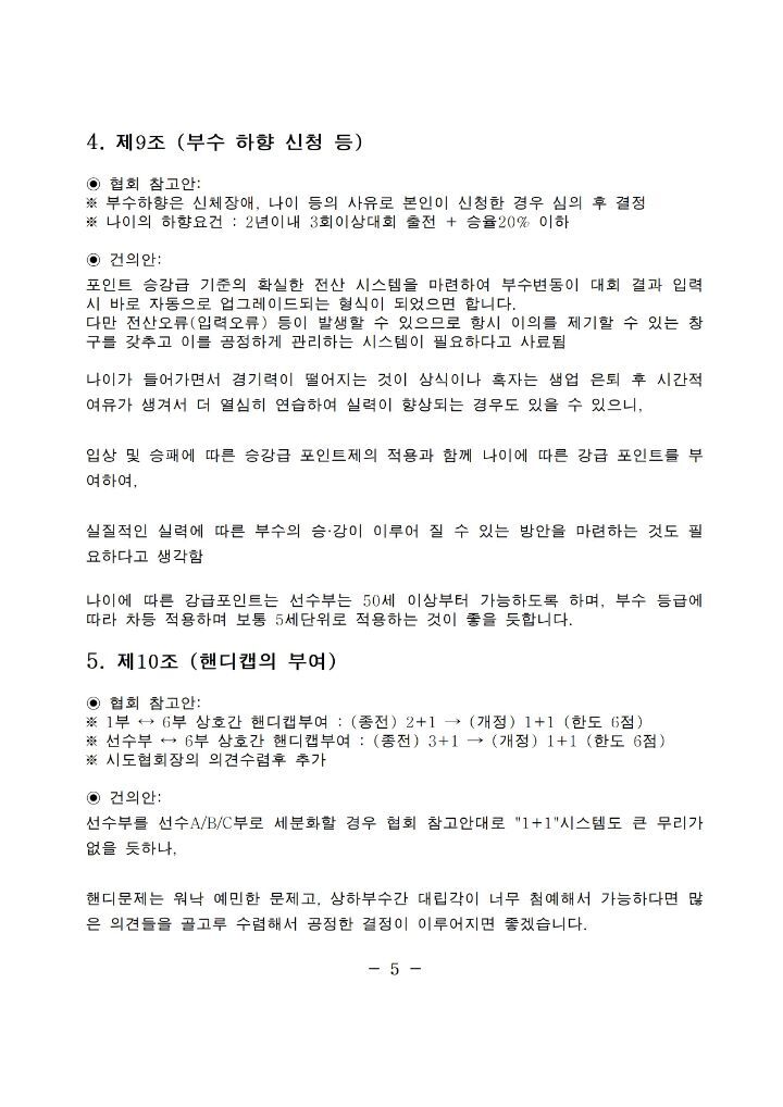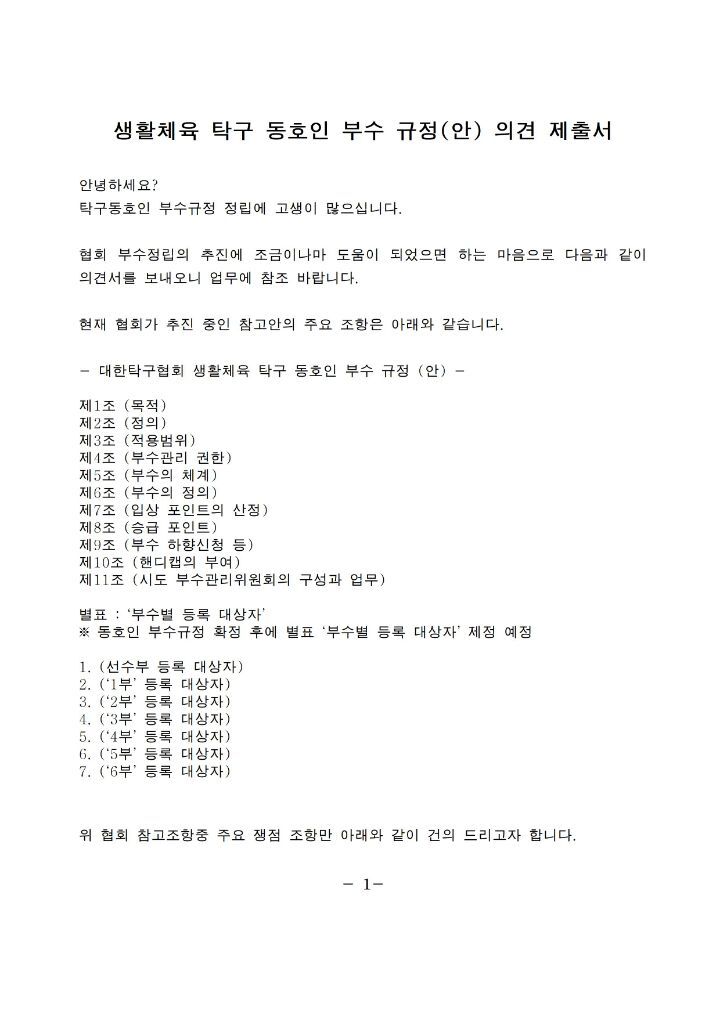 저의 건의문을 별첨 파일과 같이 첨부하오니 탁구동호인 분들의 적극적인 검토와 조언을 부탁드립니다.