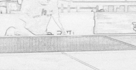 2) 상대 백쪽을 보면서도[이때 어깨 100도] 임펙트 순간에 갑자기 포핸드로 코스 빼기 (또는 종종 반대로도),