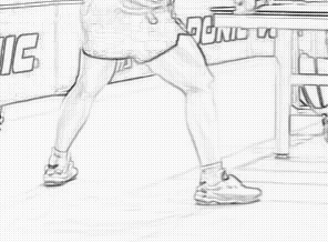 무릎을 순간적으로 눌려주면서 공을 잡아주기(보폭은 어깨보다 1.5배 가까이 계속 유지하기)