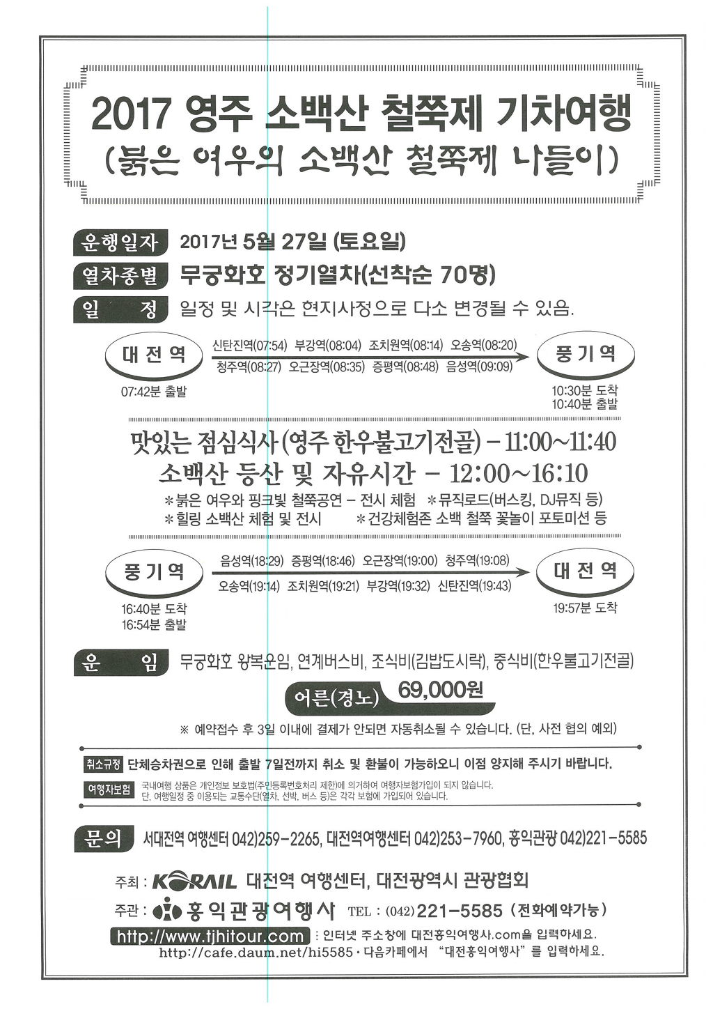 [정기열차]2017년 5월27일(토요일) 영주 소백산 철쭉제 기차여행!! 작성자대전홍익관광|작성시간17.05.10|조회수481 목록 댓글 0 글자크기 작게가 글자크기 크게가 다음검색 현재 게시글 추가 기능 열기 북마크 공유하기 신고 센터로 신고 댓글 댓글 0 댓글쓰기 답글쓰기 댓글 리스트