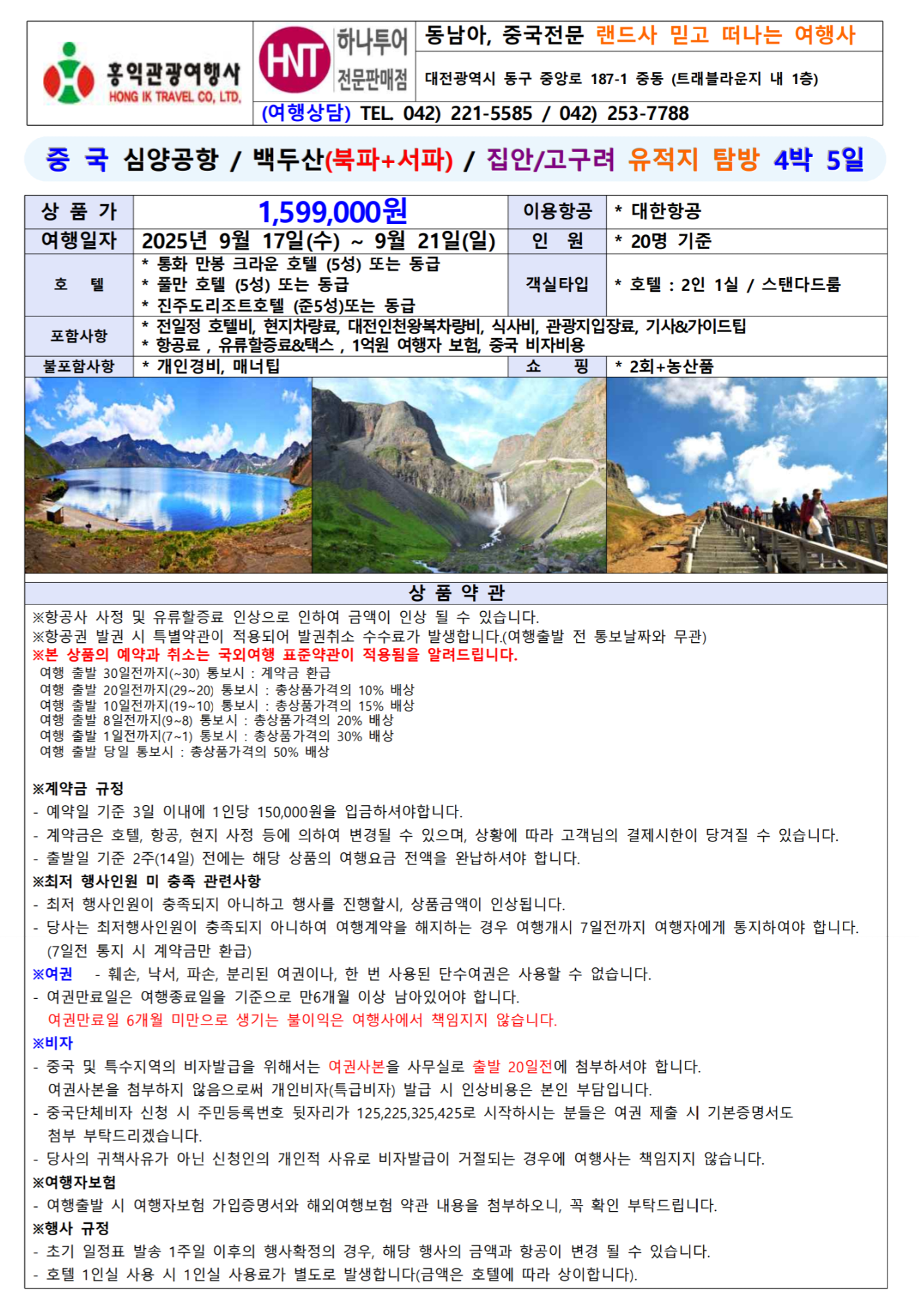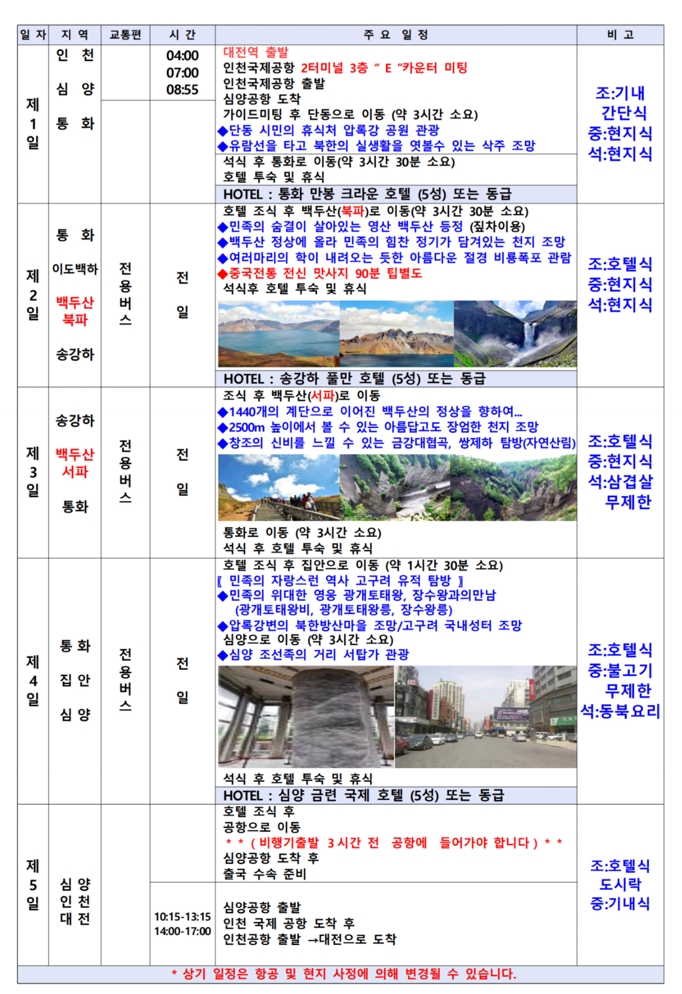 포함사항 : 전일정 호텔비, 현지차량료, 대전인천왕복차량비, 식사비, 관광지입장료, 기사&가이드팁, 항공료 , 유류할증료&택스 , 1억원 여행자 보험, 중국 비자비용