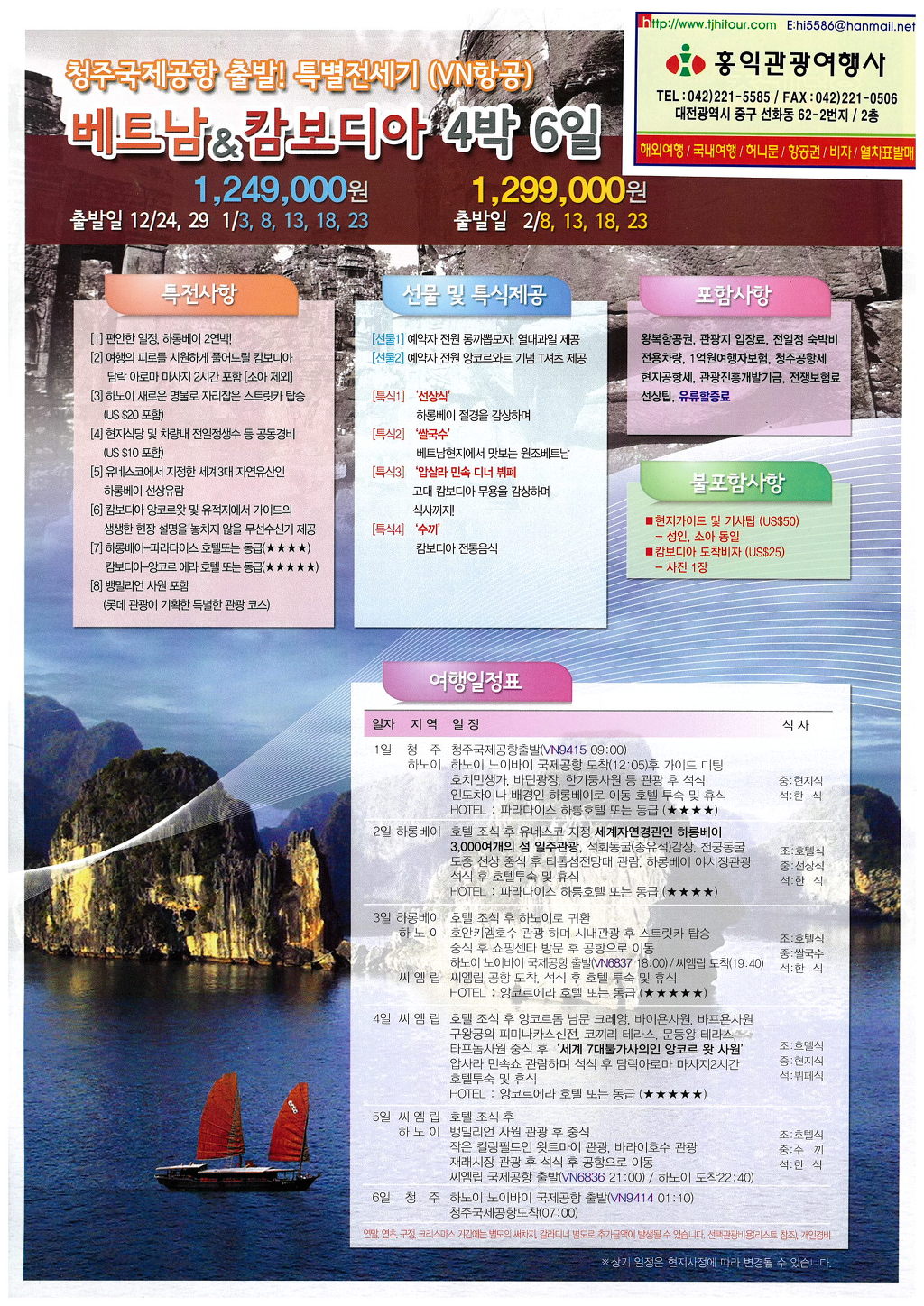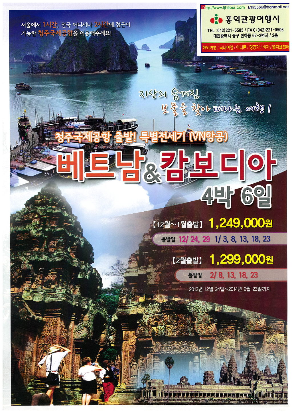 **청주출발**베트남/캄보디아 6일 작성자대전홍익관광|작성시간13.11.14|조회수449 목록 댓글 0 글자크기 작게가 글자크기 크게가 가까운 청주 공항에서 앙코르왓트의 전설이 살아 숨쉬는 캄보디아와 베트남으로 GO GO 씽~~ 다음검색 현재 게시글 추가 기능 열기 북마크 공유하기 신고 센터로 신고 댓글 댓글 0 댓글쓰기 답글쓰기 댓글 리스트
