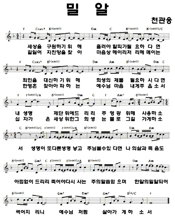 밀알-천관웅 작성자준|작성시간09.01.08|조회수22,238 목록 댓글 0 글자크기 작게가 글자크기 크게가 천관웅-밀알.mp3 첨부파일첨부된 파일이 2개 있습니다. jpg 파일 밀알_악보.jpg 다운로드 mp3 파일 천관웅-밀알.mp3 다운로드 다음검색 현재 게시글 추가 기능 열기 북마크 공유하기 신고 센터로 신고 댓글 댓글 0 댓글쓰기 답글쓰기 댓글 리스트