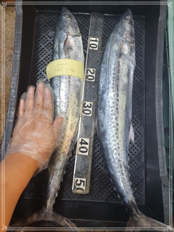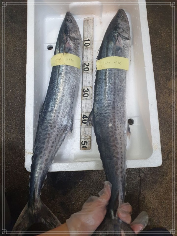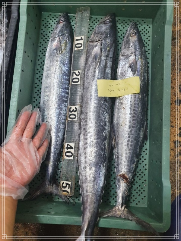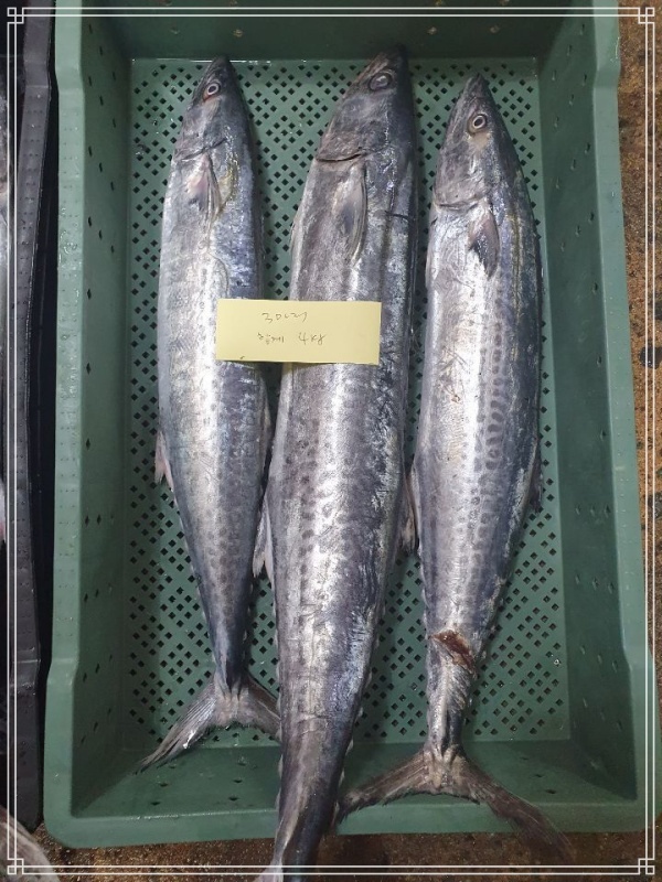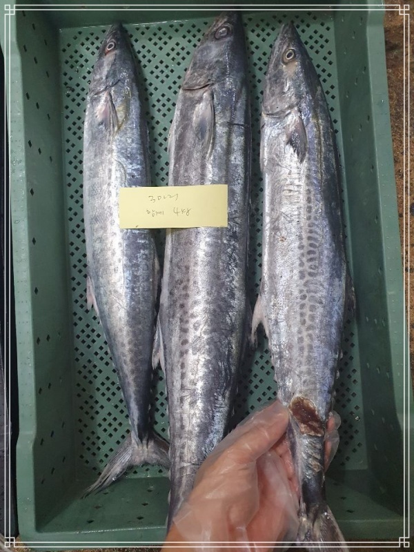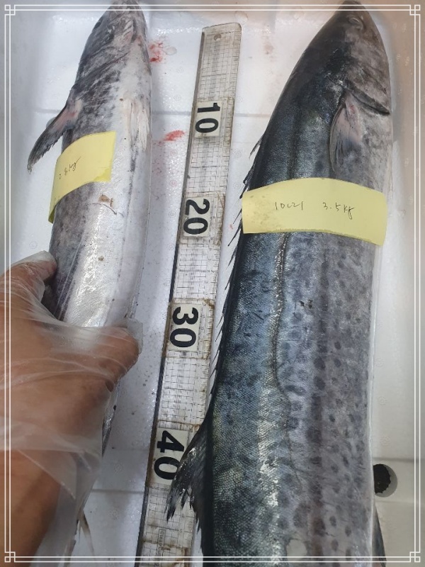 생물 삼치 굵은씨알로 1마리당 무게 2.8kg / 3.5kg입니다.