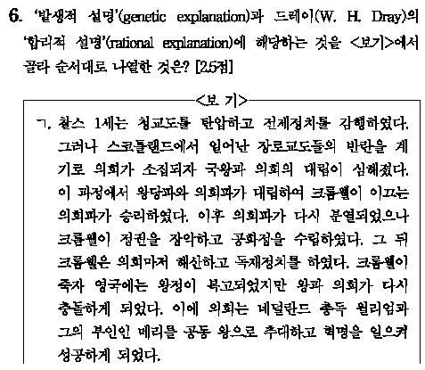 과학적 설명 방식은 포퍼와 함펠 같은 신실증주의자들이 주장하였다. 역사적 사건을 보편적 법칙(배타적 단일한 원인)으로 환원해서 설명하는 방식으로 그 안에는 연역적- 법칙적 설명, 귀납적-확률적 설명, 발생적 설명 방식 등이 있다. 행위 이론으로는 성향적 설명과 상황이론이 과학적 설명방식에 속한다. 이에 반해서 관념론자(자율론자)들은 역사행위 의지와 동기를 강조하면서 감정이입, 역사적 상상, 내러티브 등을 주로 이용한다. 월쉬의 총괄이론(총괄개념)과 합리적 설명(라이터이론과 도나간이론)은 관념론자와 신실증주의자의 의견을 통합한 설명방식이다. 법칙성 안에 인간의 의지와 동기를 담아내려고 했다. 여기에서 묻고 있는 것은 과학적 설명방식의 발생적 설명방식과 드레이 합리적 설명 이론이다. 발생적 설명 방식은 각 사건의 단계를 인과적으로 연결해서 설명한다. 각 단계의 원인은 대개 암시적으로 법칙 또는 일반화가 포함되어 있다. 중요한 단계에 한해서 법칙이 제시된다. 최초의 단계로부터 최종단계까지 전 과정에 걸쳐서 하나의 법칙과 이론이 사용되는 것이 아니라 단계가 바뀔 때마다 별개의 법칙이 사용한다. 연역적 법칙적 설명은 사건이 하나의 기술로 되어 있지만 발생적 설명은 사건이 여러 가지 기술로 되어 있다는 것이 차이점이다. 각 단계에 내포하고 있는 사건의 원인이 한가지로만 구성되어 있다는 것도 여러 가지 원인으로 구성되어 있는 내러티브 서술방식과 차이점이다. ㄱ 지문은 발생적 설명 방식이다. ‘① 찰스 1세는 청교도를 탄압하고 전제정치를 감행하였다 → ② 스코틀랜드에서 일어난 장로교도들의 반란을 계기로 의회가 소집되자 국왕과 의회의 대립이 심해졌다 이 과정에서 왕당파와 의회파가 대립하여 크롬웰이 이끄는 의회파가 승리하였다.→ ③ 이후 의회파가 다시 분열되었으나 크롬웰이 정권을 장악하고 공화정을 수립하였다’ 기술 ①이 기술 ②로 넘어갈 때 그 안에는 ‘전제정치 강해지면 내부로부터 반발이 강해지고 특정한 계기가 되어 분출 된다’라는 일반적인 원리가 원인(L1)으로 사용되고 있다. 기술 ②가 기술 ③으로 넘어갈 때 그 안에는 ‘내부의 모순과 분열은 외부의 적이 있을 때 봉합되지만 외부의 적이 없어질 때 표출되어 나온다’라는 일반적 원리가 원인(L2)으로 사용되고 있다. (이것은 순전히 제 생각입니다. ^^;;) 드레이 합리적 설명 모형은 포퍼의 상황의 논리와 같이 합리성(목적-상황-수단에 따라 결정)을 수용했지만 개인의 의도와 동기를 강조하여 보편적인 합리성을 거부했다. 다른 사람이 보기에는 합리성을 띤 행동이 아니라도 그 사람 입장에서 합리적일 수 있다고 주장한다. 사건을 대처하는 방식에 대해서도 보편적 법칙에 따라 행동하는 것이 아니라 이유에 따라 사건에 대처하고 자신의 행위를 결정한다. ㄷ의 지문은 루이 14세의 행위가 객관적 시각에서 보면 비합리성을 띤 행동이다. 그렇지만 유럽의 패권을 장악한 목적을 가진 루이 14세는 영국의 명예혁명 상황을 적극적으로 이용할 필요가 있는 것이고 네덜란드 총독인 월리엄과 영국의회가 손을 잡아서 제임스 2세와 대결을 부추길 필요가 있었다. 네덜란드를 압박한 군사적 압박을 풀어서 월리엄이 영국에 건너갈 수 있도록 간접적으로 도와준 것이다.(결과적으로 볼 때 루이14세의 의도대로 되지는 않았다)