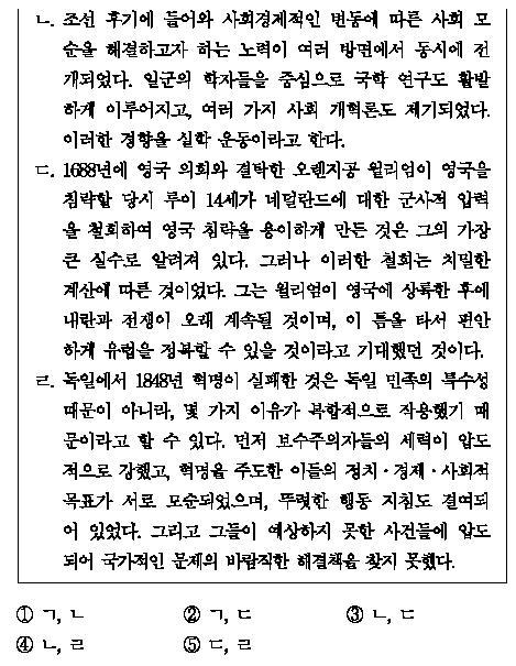 ㄴ 지문은 총괄설명과 관련된 예문이다. 총괄설명은 적용범위상 여러 가지 사례에 적용될 수 있는 일반적 총괄개념과 한가지 사례에만 적용된 단일한 총괄개념으로 분류된다. 그리고 특성상 역사적 변화의 형식만을 가리키는 형식적 총괄개념과 일단의 관념과 가치를 바탕으로 일어나고 있는 성향적 총괄개념으로 분류된다. 이 지문에서 실학이라는 개념은 단일한 성향적 총괄개념으로 조선 후기의 사회경제적 변동에 대응하는 사회개혁적 의지에 따라서 형성된 흐름을 총괄개념으로 제시한 것이다. ㄹ. 내러티브 방식이다. 내러티브는 한 가지 원인이 아니라 여러 가지 원인이 내포되어 있다. (정확하게 사전적 의미로서 인과관계라기보다는 상관관계로 표현하는 것이 옳다) 그리고 그 원인도 뒤에 있는 사건을 배타적으로 환원시켜서 설명해주는 것이 아니라 단지 그럴 가능성만 제시해 준다. 역사적 원인을 기술한 용어로서는 ‘왜’,‘이유’ '아주 중요한‘이라는 식으로 서술된다. 독일의 1848년 혁명(3월 혁명)의 실패 원인을 다양하게 제시함으로써 한 가지 원인으로만 구성된 기존의 과학적 설명방식과는 거리가 멀다.