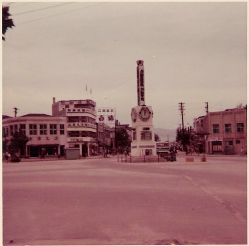 중앙로타리, 미원간판 건물이 당시 맛있는 아이스께끼를 만들던 코롬방 빙과회사 건물 우측 나무 옆 건물은 현재 패션 큐 건물로 당시 원형을 그대로 보존하고 있는 건물입니다