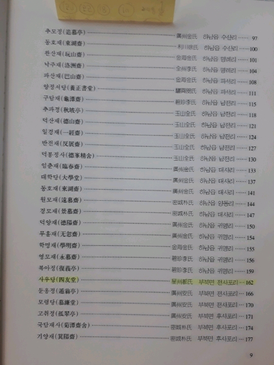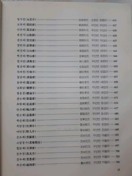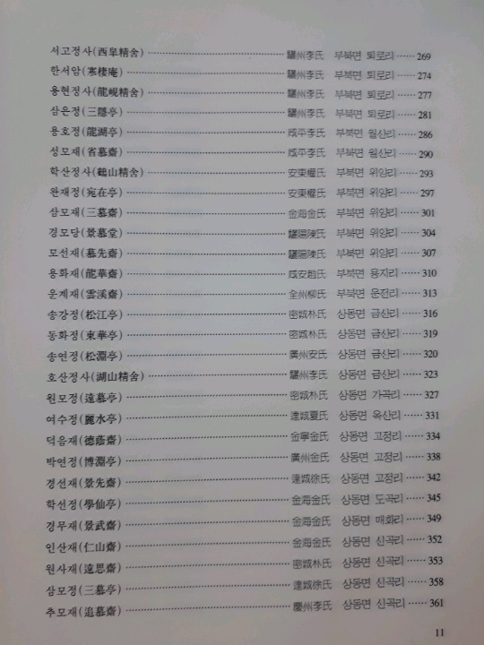 ②재실의 명칭과는 거리가 좀 있어 보이는 명칭이 精舍 10개, 書堂 8개, 軒 1개, 臺 1개, 閣 1개, 祠 1개, 庵 2개로 보이는데, 이는 실재 용도 등으로 분류한 것으로 보이며