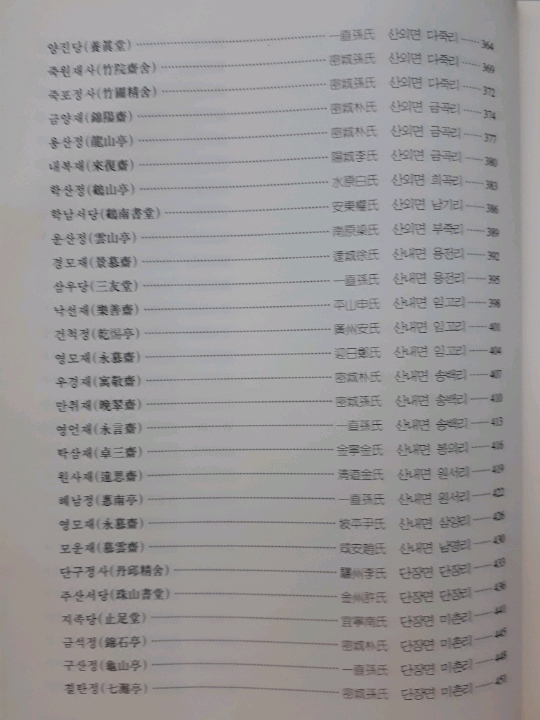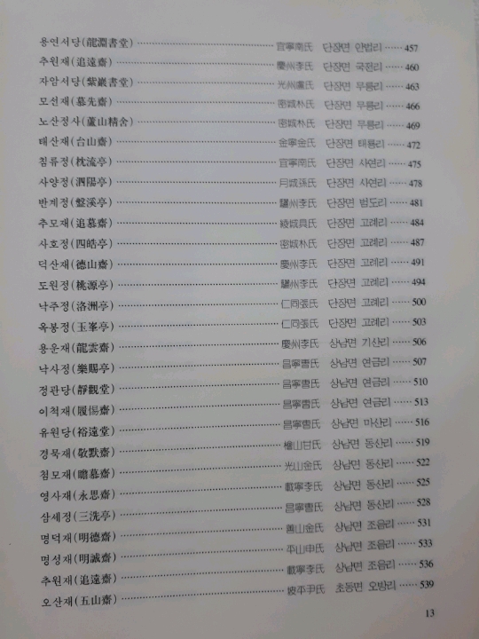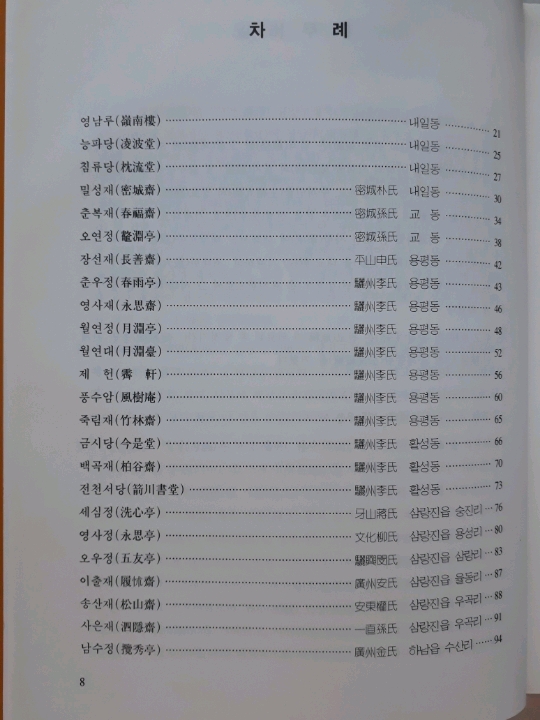●특히 각 문중의 재실은 기문(記文) 또는 중건기(重建記) 등을 현판에 편액하였는데 그 현판에 전부 한문으로 되어 있어 한문학자가 아니면 그 뜻을 거의 알 수가 없었는데, 밀양문화원에서 밀양시의 예산을 보조를 받아 『국역 밀양누정록』을 간행하였는데, 재실의 주인공과 재실 건립 취지 또는 최초 건립 및 중수한 인물 등을 잘 알 수 있게 번역을 해 놓았습니다