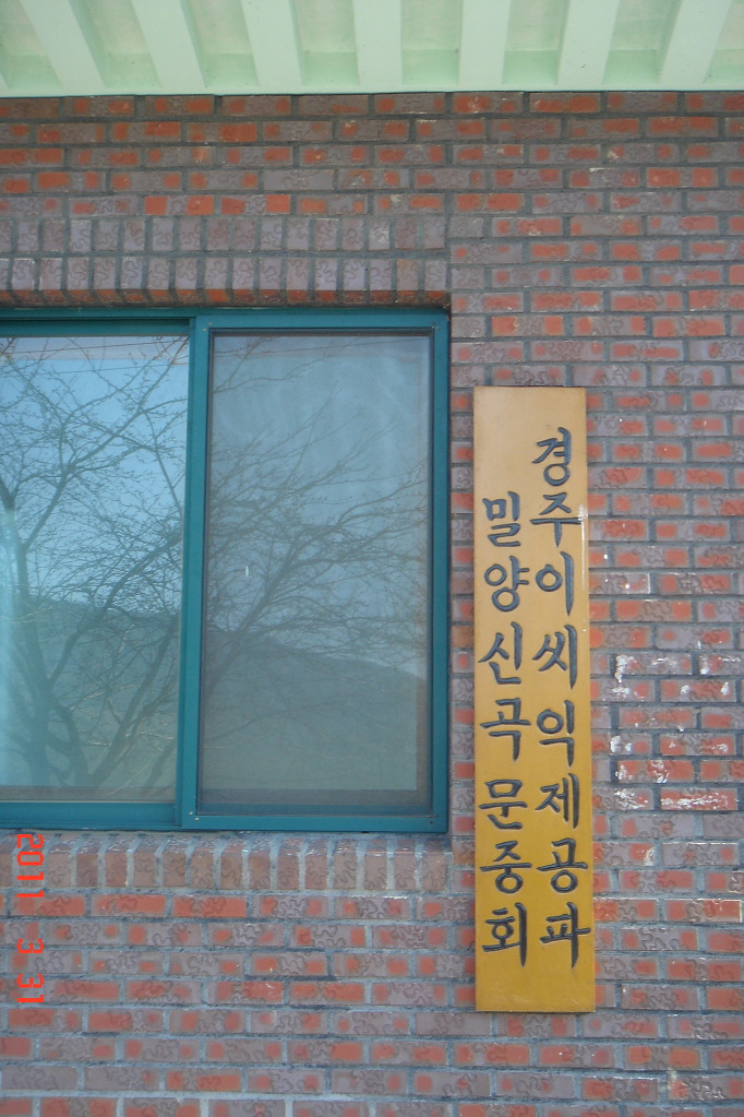 세로로 된 간판(위 사진)에 판각된 글자(경주이씨 익제공파 밀양신곡문중회)"을 보고 적은 것입니다