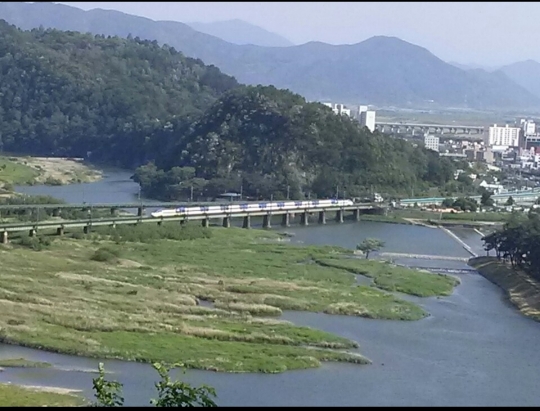 ○영남루가 있는 무봉산(舞鳳山, 일명 아동산 衙東山)의 무봉대(舞鳳臺)에서 바라본 《경부선 밀양강철교》에 《KTX 산천》이 서울ㆍ행신을 향해 달리고 있습니다