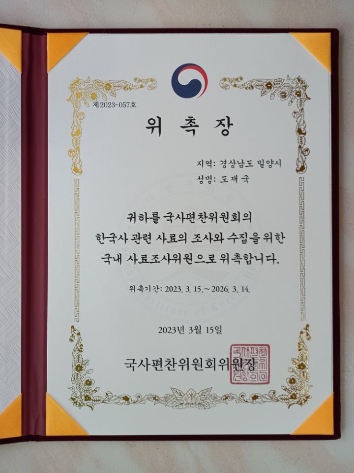 ○국사편찬위원회 사료조사위원 위촉장을 받았습니다