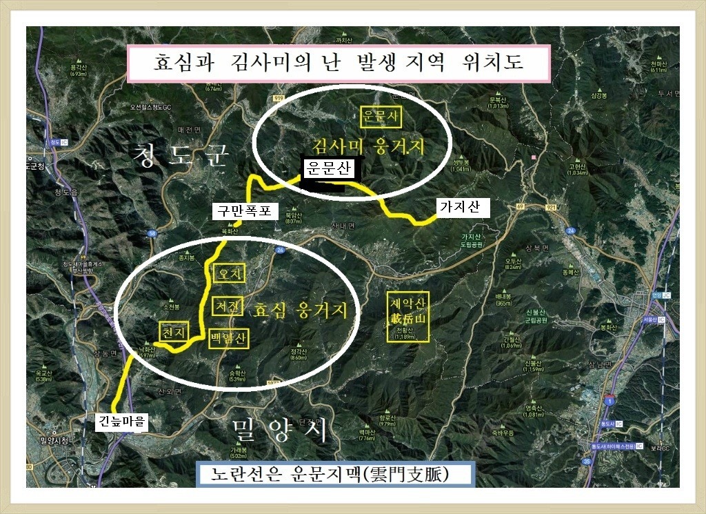 그리고 이의민(李義旼) 같은 독재권력자는 자신의 더 큰 탐욕(貪慾)을 채우기 위해 굶주린 백성들을 감언이설로 속여 “신라부흥(新羅復興)”이라는 반역(叛逆)을 도모(圖謀)하려 했다. 이러한 대표적인 민란이 운문지맥(雲門支脈) 밀성(密城) 고을에서 발생한 “효심(孝心)의 난(亂)” 즉, 고려시대 대표적인 민란(民亂)의 전말(顚末)이다.