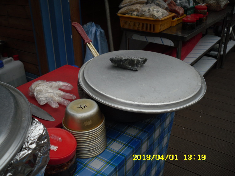 양은쟁반을 덮어 둔 자리에 막걸리통이 있습니다.