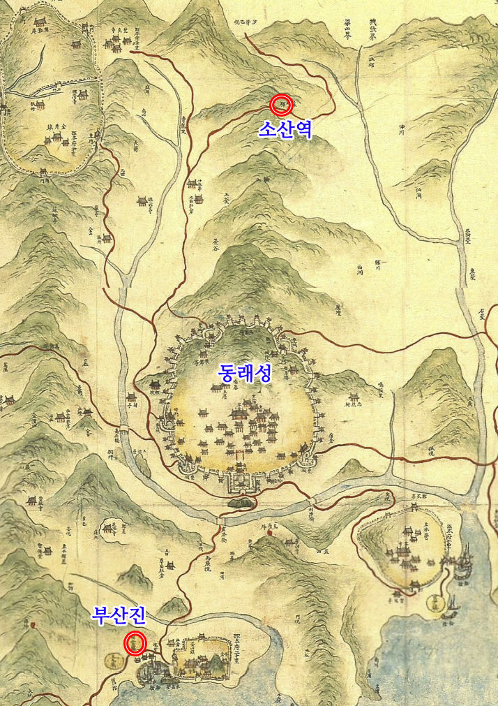 1872년 지방지도 기준 - 부산진, 동래성, 소산역 위치