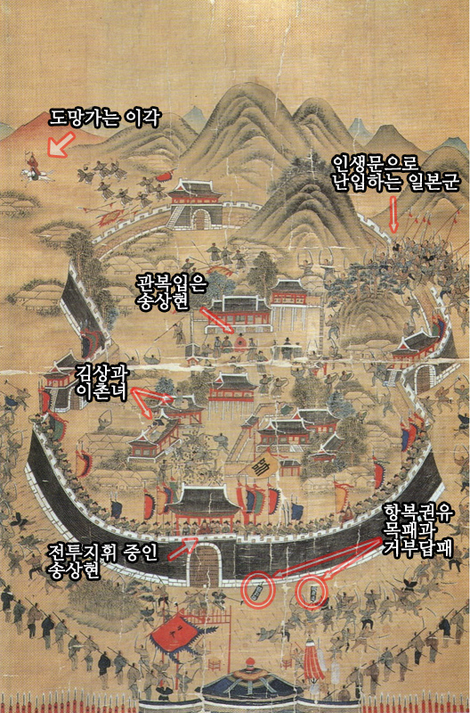 전투가 시작되자 송상현을 비롯한 지휘부는 남문을 중심으로 방어를 합니다만 일본군은 수비가 취약한 인생문 방면을 집중 공격하여 성벽 일부를 무너뜨리고 성 안으로 난입합니다.