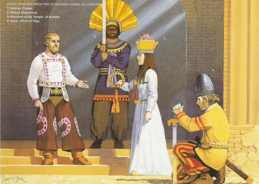1번의 인물인 바흐람 추빈(bahram chobin)은 사산조 페르시아 말기의 풍운아였습니다. 그는 지금의 테헤란 남쪽의 도시인 라이이(rayy) 출신의 귀족으로 호르미즈드 4세(재위 기간: 579~590) 황제 시절, 멀리 페르시아의 동북 국경 지역을 침략해온 투르크(서돌궐)족의 30만 대군에 맞서 1만 2천 명의 정예 기병인 사바란(savaran)을 이끌고 나가 싸워 대승을 거둔 페르시아의 영웅이었습니다.