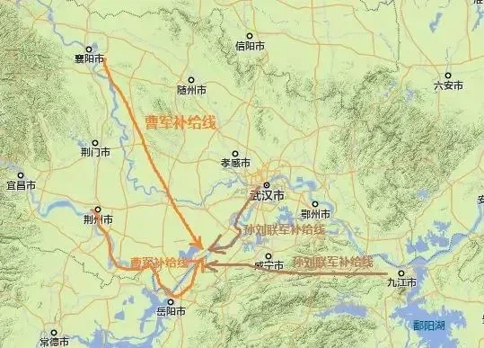 조조의 양로 병마는 이러하다. 일로는 육군으로 조조의 주부(主簿) 조엄(趙儼)이 도독호군(都督護軍), 영장릉태후(領章陵太守)로, 우금(于禁), 장료(張遼), 장합(張郃), 주령(朱靈), 이전(李典), 노초(路招), 풍해(馮諧)의 7군(軍) 및 문빙(文聘)의 강하(江夏)북부지방부대, 합계 근 4만명으로 이루어져 있고, 양양(襄陽)에서 한수(漢水)를 따라 남하하며 유기(劉琦), 관우(關羽)가 지키는 하구(夏口, 지금의 漢口)를 공격했다. 다른 일로는 수군(水軍)으로 조조가 직접 지휘하며, 형주병(荊州兵)을 합하여 약 15,6만으로 강릉(江陵)에서 장강(長江)을 따라 내려가면서, 직접 육구(陸口)로 진격했다. 육구를 돌파하면, 그 후에는 일사천리로 내려가서 순조롭게 하구, 번구(樊口)에 이르러 유비의 최후근거지를 격파할 수 있을 것이다. 또한 육구(陸口)에서 육수(陸水)로 들어가 상륙하여, 장강남쪽의 양두산(羊頭山, 通山)의 저산구릉지구를 통과하여, 다시 양신(陽新)을 지나면 직접 손권의 수군본부 시상(柴桑, 지금의 九江)을 취할 수 있을 것이다.