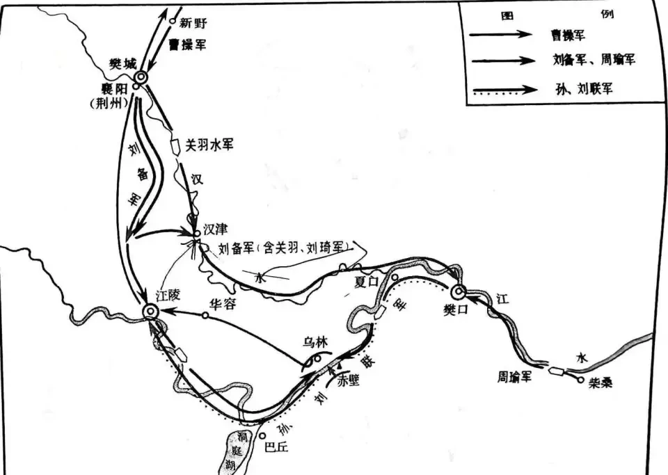 조조의 양로 병마에 맞서서, 주유(周瑜)는 유비와 상의한 후 상응한 병력배치를 한다. 그는 병력을 둘로 나누어, 일로는 관우가 만여명의 수병, 보병을 이끌고 하구의 북쪽에서 조조의 군대와 전투와 퇴각을 계속하게 했다. 이를 통해 그들의 진격을 늦추는 것이 목적이다. 그렇게 하면, 주유의 수군주력이 배후의 안전을 보장받을 수 있게 된다. 다른 일로는 공세전략을 취하기로 한다. 주유가 3만의 수군으로 앞에 서고, 유비는 직접 수천의 정예병을 이끌고 뒤에 위치한다. 번구(樊口, 지금의 호북성 악주시 서쪽)에서 장강을 거슬러 올라가, 조조보다 먼저 육구(陸口)에 도착하여 수군군영을 설치한다. 이를 통해 육수를 봉쇄한다. 그리고 이곳의 적벽산(赤壁山, 당시의 명칭은 石頭山) 일대의 강위에 선진(船陣)을 펼치고, 적극적으로 조조의 수군부대를 맞이한다. 생사의 성패는 이 전투에 달렸다. 이것이 바로 중국역사상 유명한 적벽대전이다.