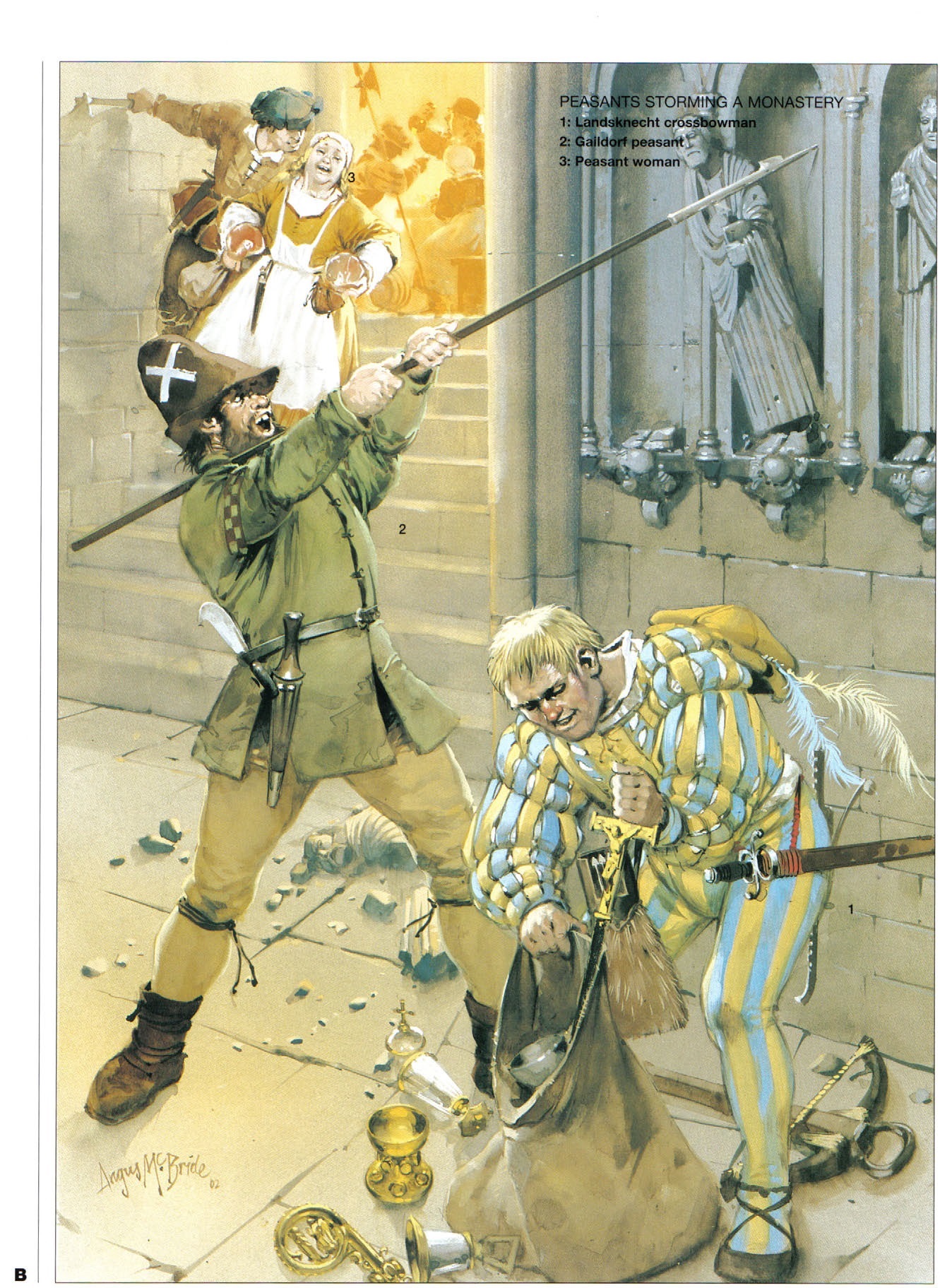 1번의 병사가 그런 경우인데, 이 1번의 란츠크네히트 용병은 석궁병으로 복무하였고, 수도원 바닥에 석궁을 내려놓은 채 수도원에서 보관하고 있던 금십자가와 금잔을 비롯한 성물들을 빼앗아서 가죽 자루에 담고 있는 중이다.