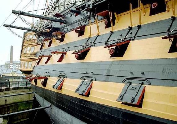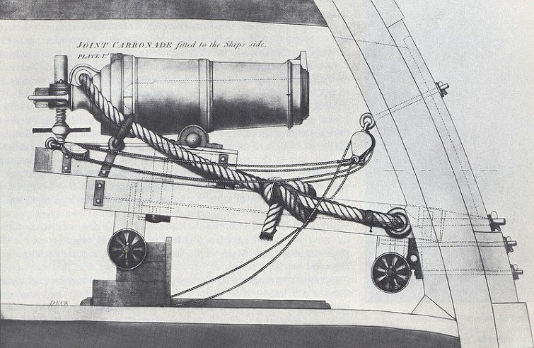 (무게가 일반 cannon의 1/3~1/4에 불과했던 저압포인 carronade 포는 스코틀랜드의 Carron 사에서 개발/제작했기 때문에 그런 이름이 붙었습니다. 이 단거리 포는 특히 전함의 후갑판에 장착되어 적의 수병이 밀집된 갑판에 대해 엄청난 파괴력을 가졌습니다. 18세기 후반 내내 프랑스 조병창에서는 이에 해당하는 무기를 만들지 못했기 때문에, 근접전에서 영국 해군이 우세를 유지하는데 큰 도움을 준 무기였습니다. 그러나 이 캐로네이드 포는 단거리 저압포라는 한계가 있었으므로, 전함의 포문수를 셀 때 그 숫자에 넣지 않는 것이 보통이었습니다.)