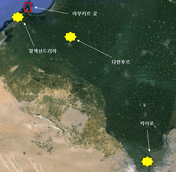 (위성 사진으로 본 현대의 아부키르 곶입니다. 이렇게 보면 넓어보이지만, 저 맨 아래 첫번째 방벽의 길이가 대략 1km 정도입니다. 굉장히 좁은 지역이라는 것을 아실 수 있습니다.)
