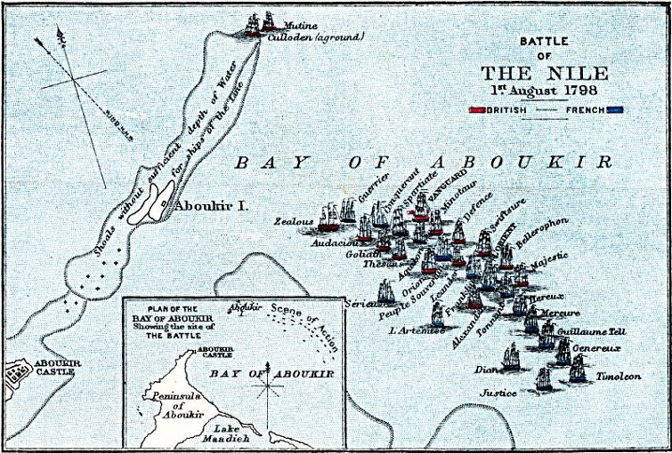 하지만 이것들이 무엇때문에 이렇게 날뛰는지에 대해서는 곧 소식이 들어왔습니다. 그것도 바다로부터요. 7월 15일 저녁, 무라드 베이를 쫓다 이제 밤을 보낼 곳을 물색하던 나폴레옹 앞에 알렉산드리아의 마르몽이 보낸 전령이 헐레벌떡 나타납니다. 그가 전한 소식은 놀라운, 그러나 사실 예상했었던 것이었습니다. 즉 아부키르 만에 영국 해군 함대의 호위를 받은 오스만 투르크 전함 5척과 프리깃 3척, 그리고 50척이 넘는 수송선이 닻을 내렸고, 이미 1만의 병력을 아부키르 곶에 내려 놓았다는 것이었습니다.