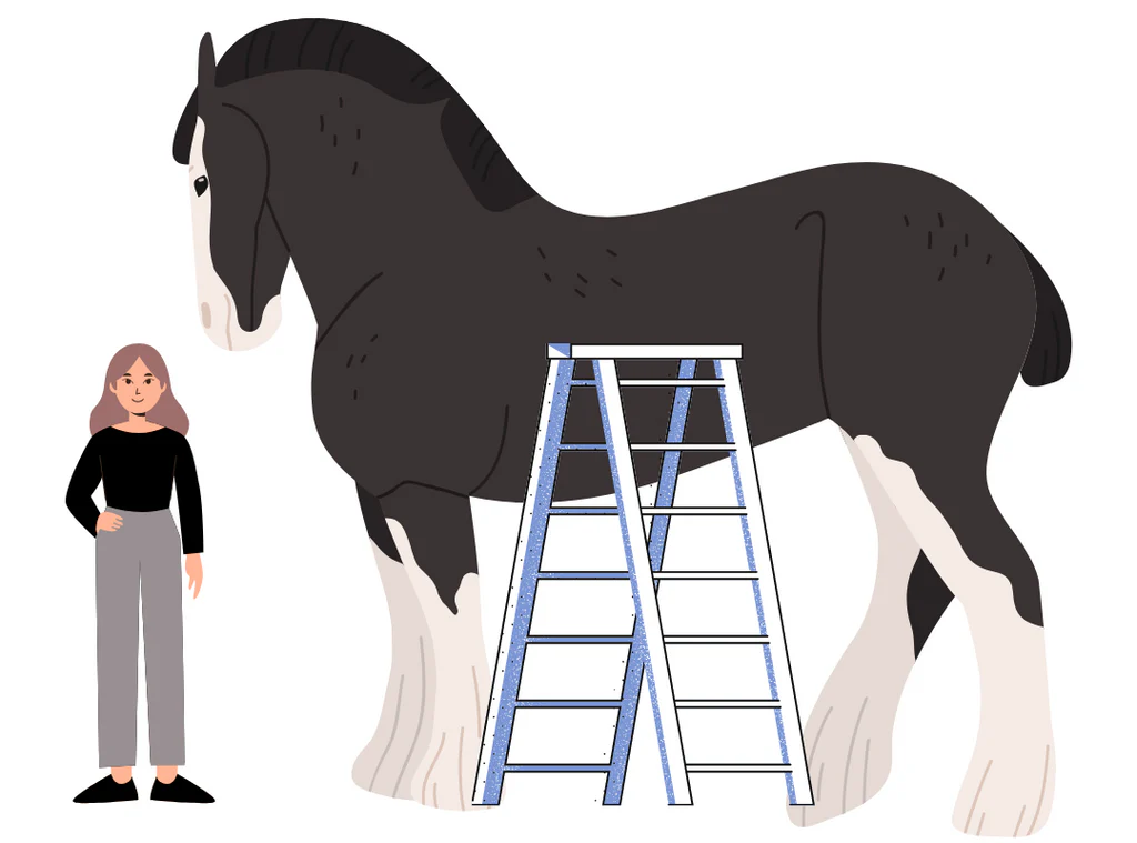 미국 여성의 평균 키는 163cm(5피트 4인치)입니다. 즉, 평균 키의 여성이 샘슨의 목덜미에 닿으려면 발끝으로 서 있을 때 손가락 끝으로 닿았을 것입니다. 이 말 위에 올라가려면 사다리가 필요할지도 모릅니다!
