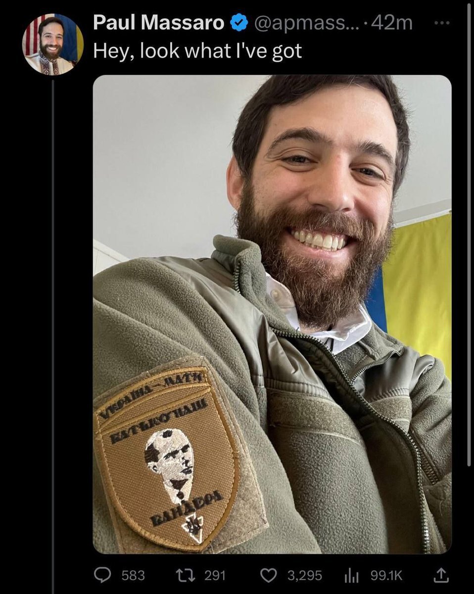 우크라이나를 응원한다며 우크라 네오나치 국부, 나치전범 반데라패치 팔뚝에 붙이고 자랑하다 지금은 트윗삭제했습니다.