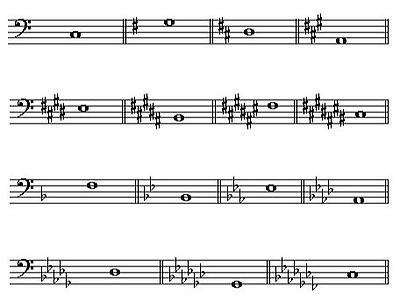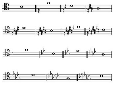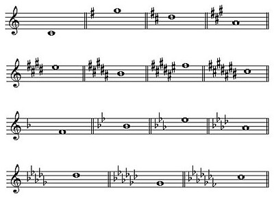 올림표 : 파 - 도 - 솔 - 레 - 라 - 미 - 시 내림표 : 시 - 미 - 라 - 레 - 솔 - 도 - 파