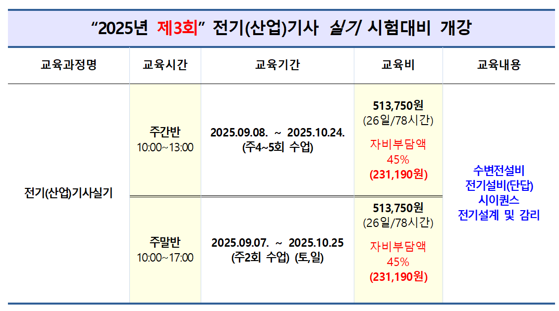 2025년 제3회 전기(산업)기사 실기 개강안내 (주말,주간반) 작성자대전전기학원|작성시간25.08.31|조회수184 목록 댓글 0 글자크기 작게가 글자크기 크게가 고용24 온라인 수강신청 https://www.work24.go.kr/cm/main.do 다음검색 현재 게시글 추가 기능 열기 북마크 공유하기 신고 센터로 신고 댓글 댓글 0 댓글쓰기 답글쓰기 댓글 리스트
