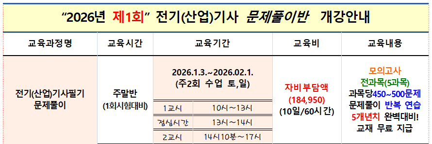 2026년 "1회" 전기(산업)기사 "필기" 시험대비 "문제풀이" 개강 작성자대전전기학원|작성시간25.11.19|조회수186 목록 댓글 0 글자크기 작게가 글자크기 크게가 다음검색 현재 게시글 추가 기능 열기 북마크 공유하기 신고 센터로 신고 댓글 댓글 0 댓글쓰기 답글쓰기 댓글 리스트